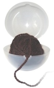 This is it - a great plastic ball that opens and allows you to place your skein of yarn in it. Close it up and the yarn stays clean, pulls out easily and just think of what your cat will think of it!